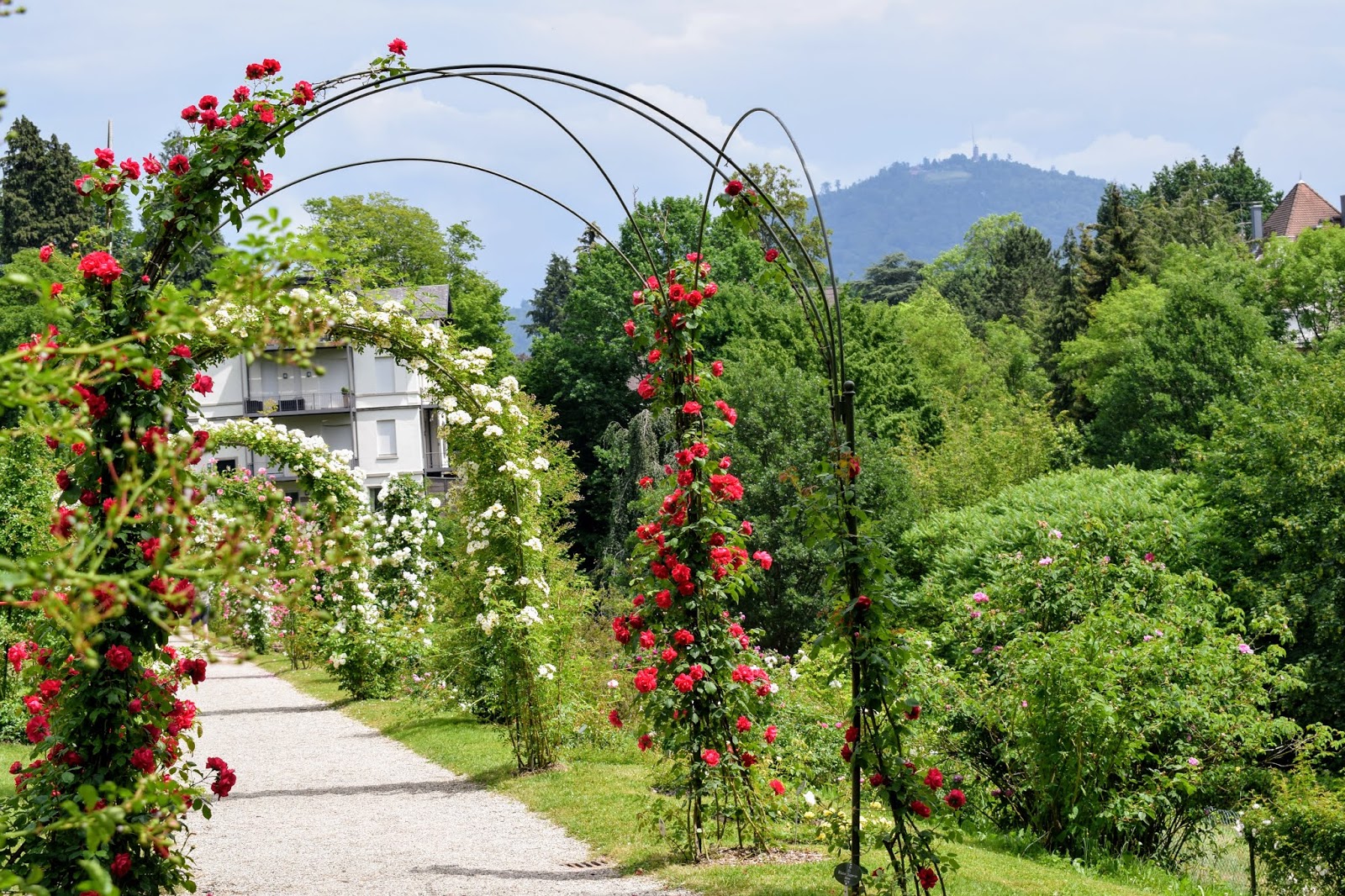 Arches of roses in Rosenneuheitengarten in Baden Baden