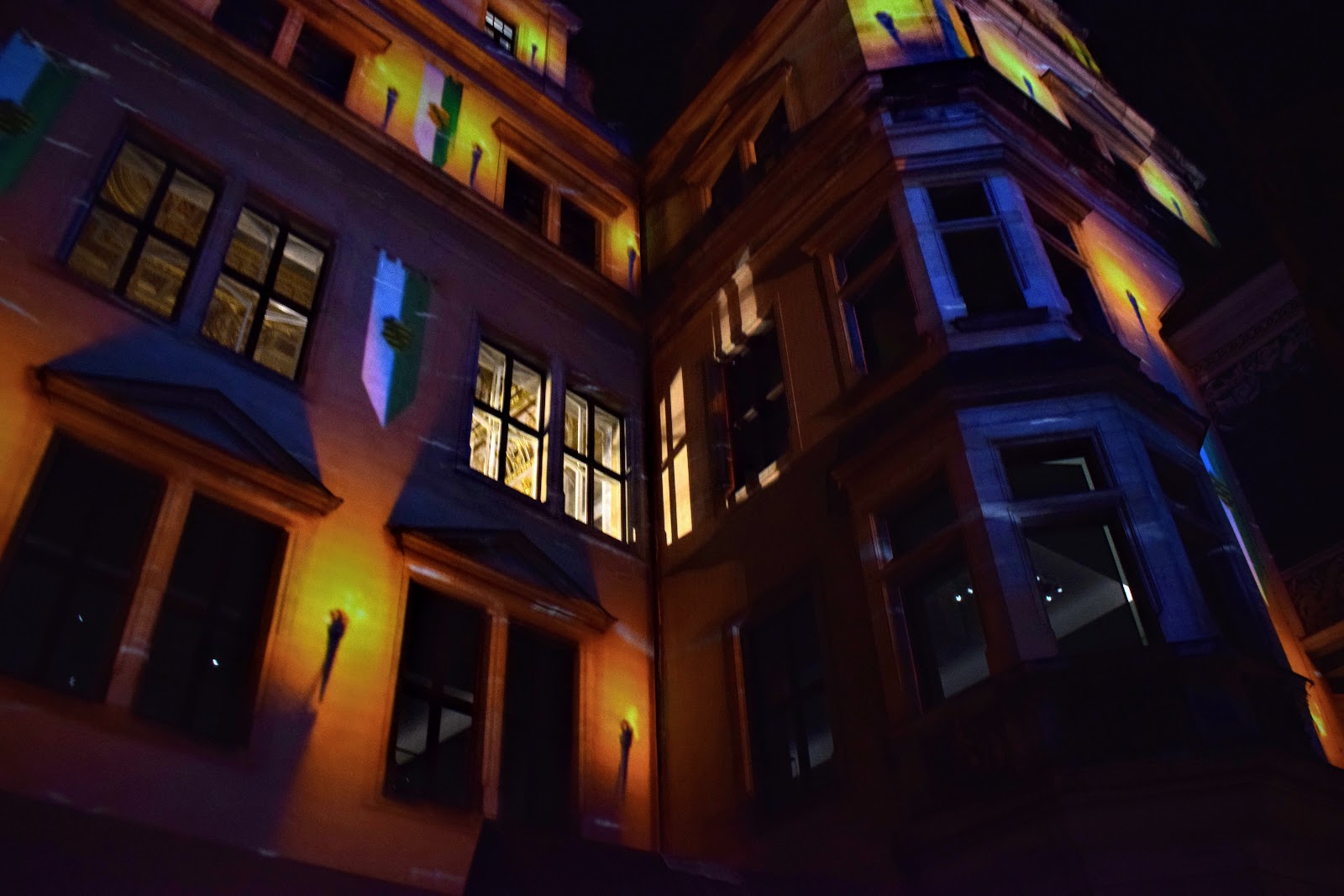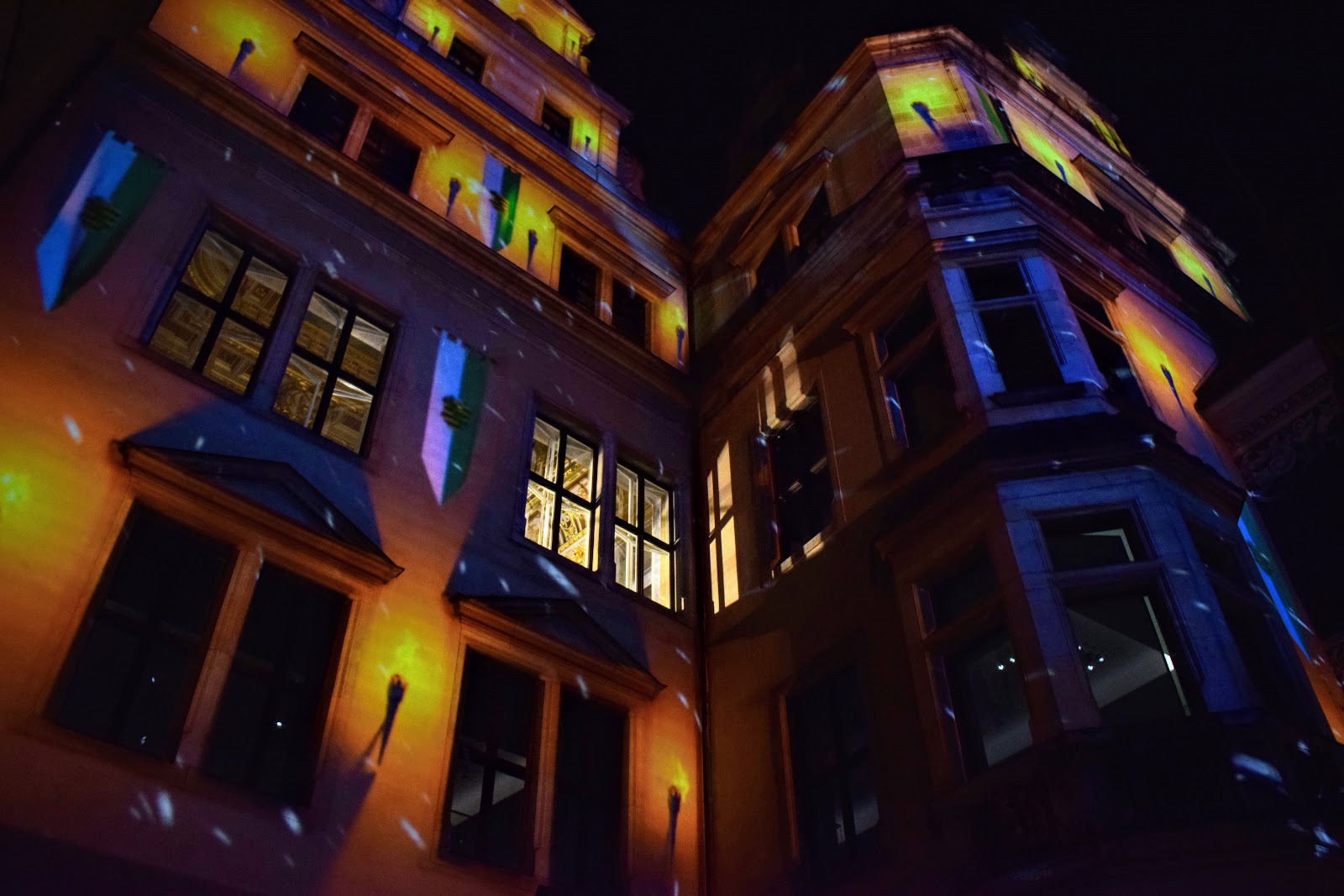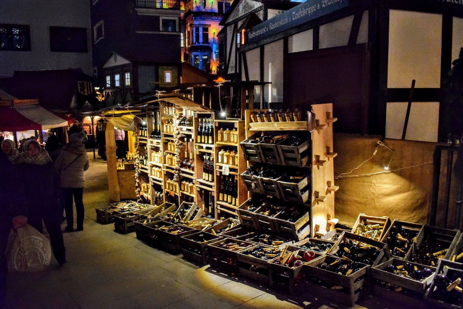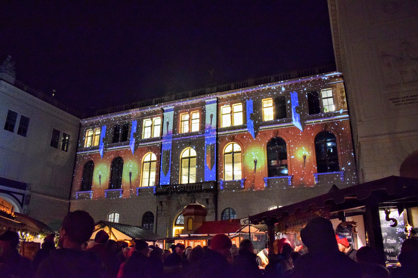 Una dintre cele trei piete de Craciun din Dresda – 2018. O piata mica si intima, intre cladiri vechi luminate feeric. Tematica pietei era una medievala.