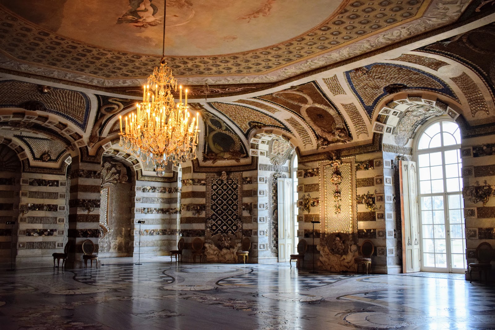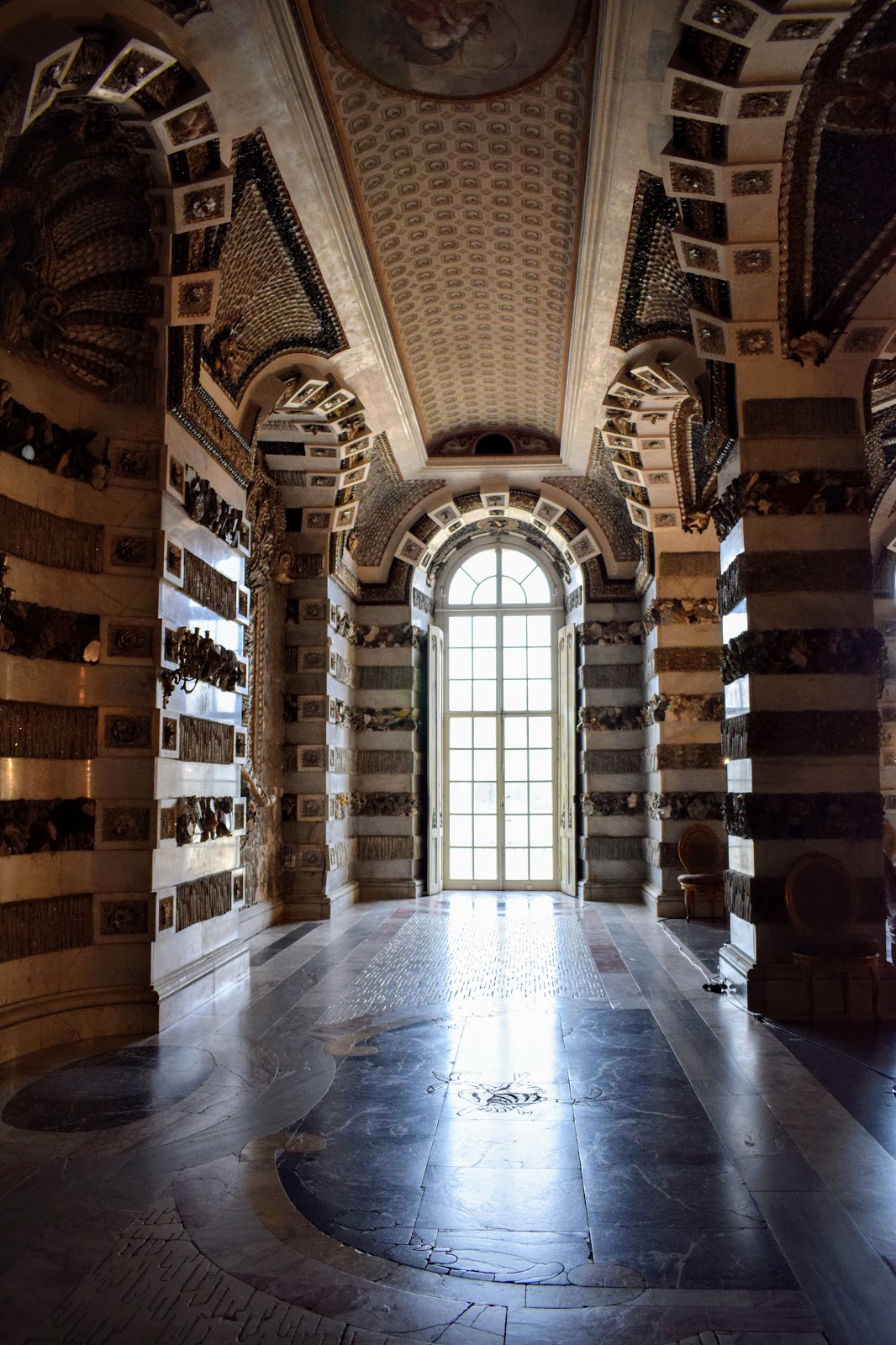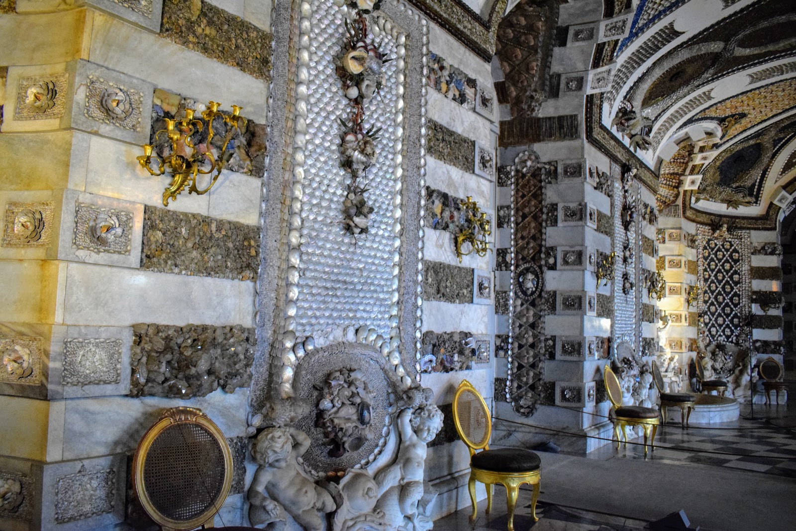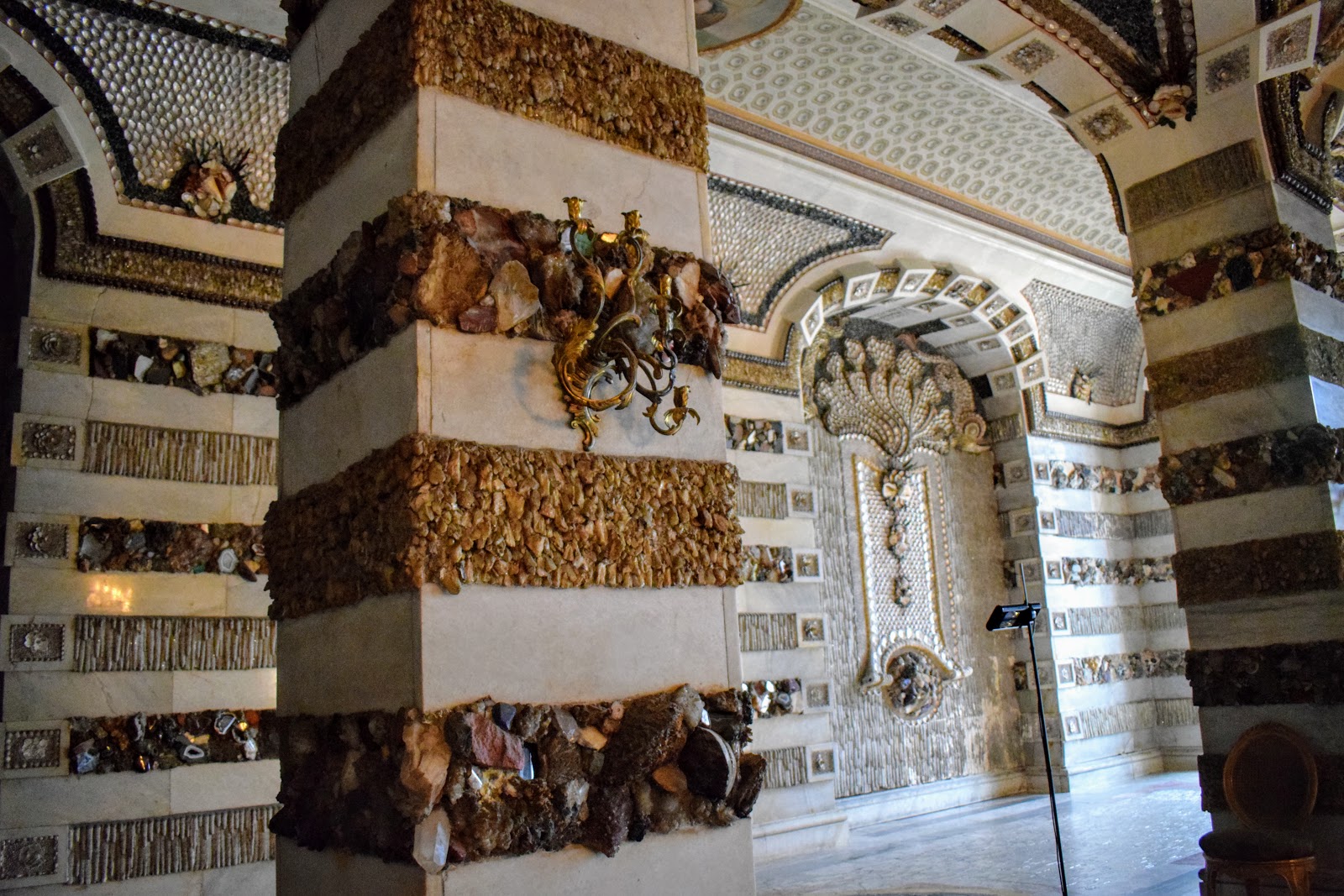 Creaturile marine si mitologice de pe pereti si tavan sunt concepute din cochilii, melci si pietre semipretioase.