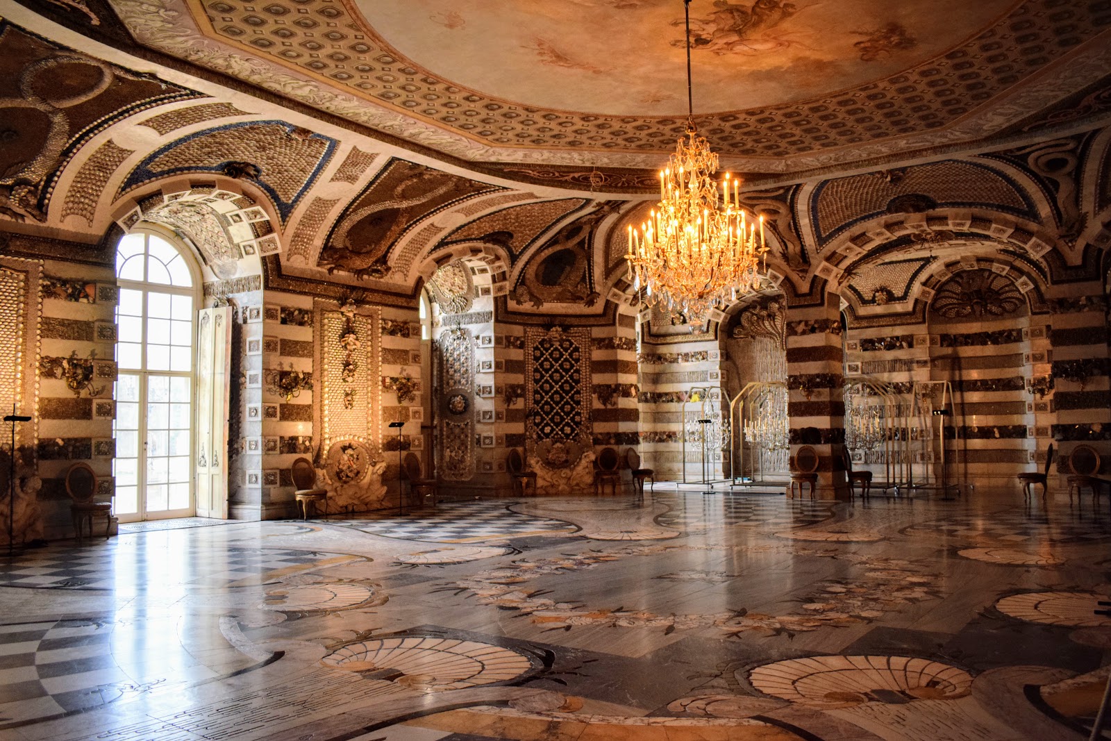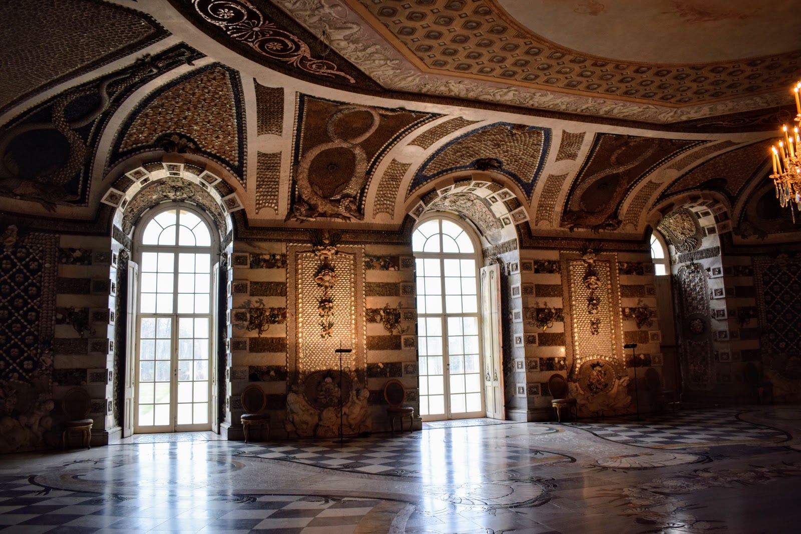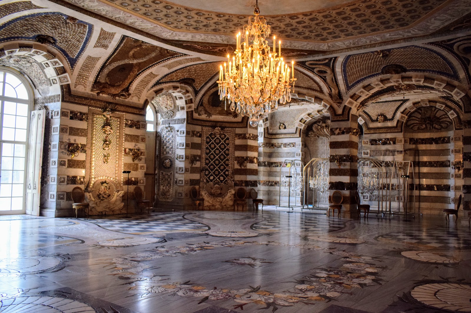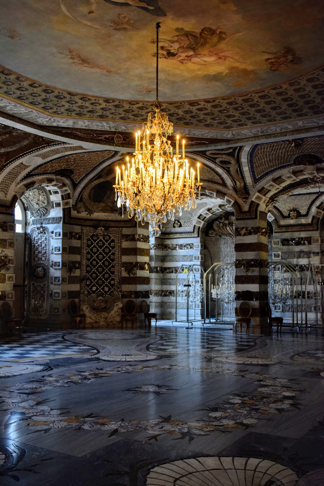 Creaturile marine si mitologice de pe pereti si tavan sunt concepute din cochilii, melci si pietre semipretioase.