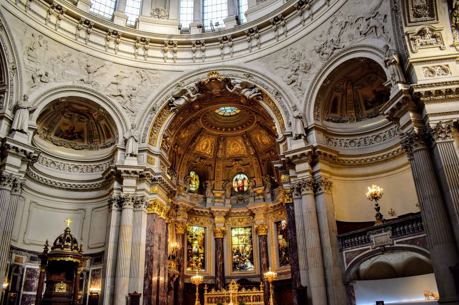 Altarul principal dateaza din 1850 si este construit din marmura si onix. Vitraliile prezinta nasterea, crucificarea si invierea Domnului.
